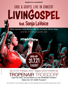 Ausdrucksvoll und stimmgewaltig brachte Livingospel & Band nach fast 2 Jahren Konzertzwangspause vor 400 Zuschauern die große Open Air Bühne an der Stadthalle Troisdorf im Rahmen der TROPENAIR Veranstaltung zum Beben.