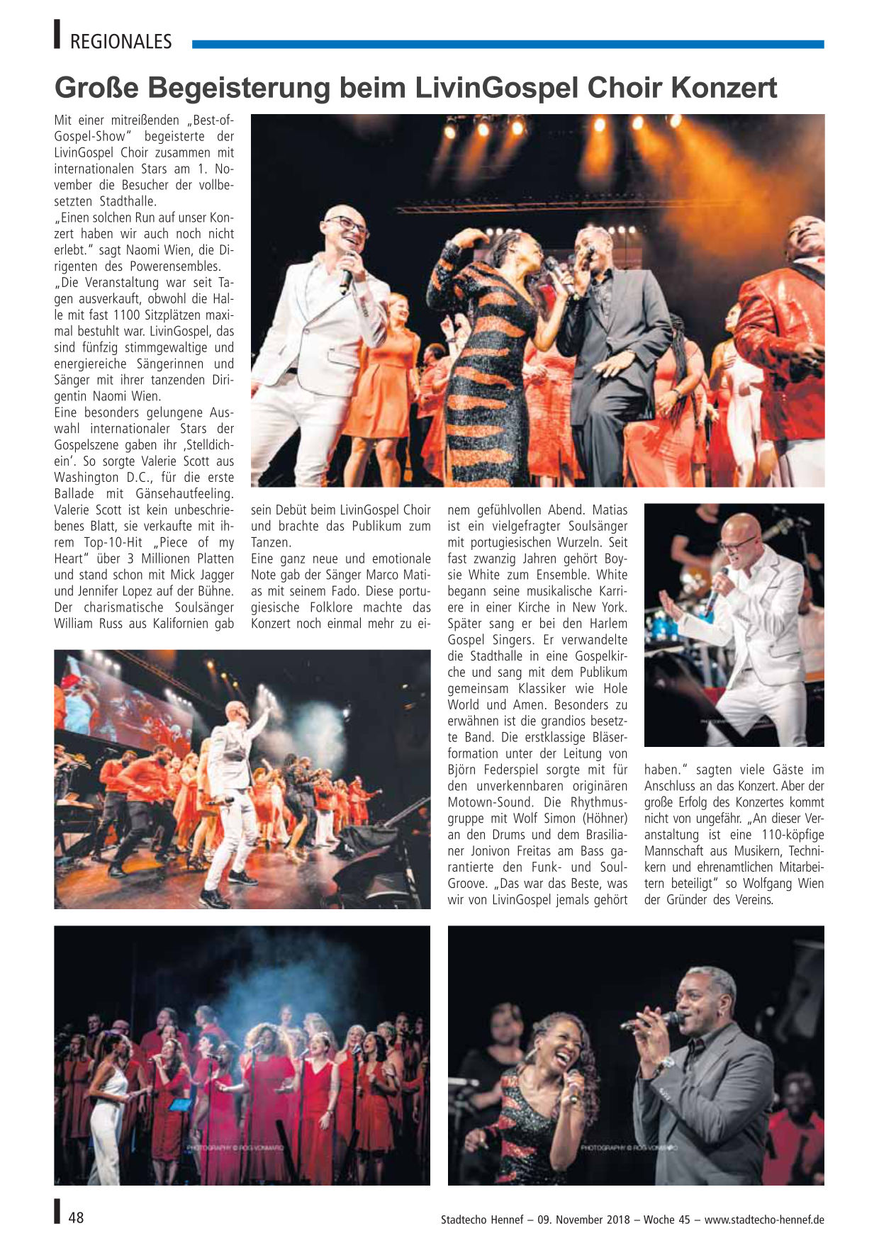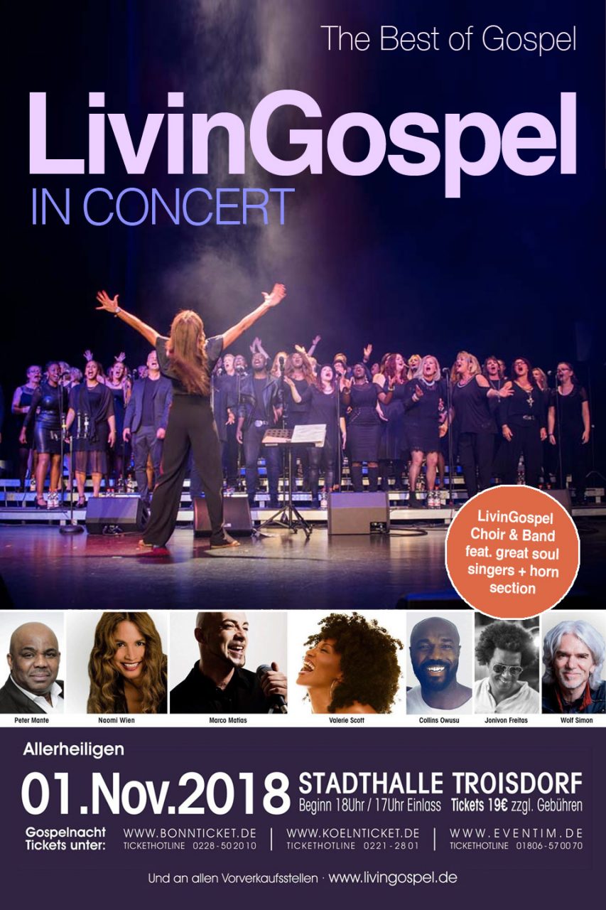 Do. 1. Nov. 2018. Das berauschende Konzert des LivinGospel Choir mit atemberaubenden Solisten, großer Band und Hornsection in der Stadthalle Troisdorf. Ausverkauftes Haus. Begeistertes Publikum.