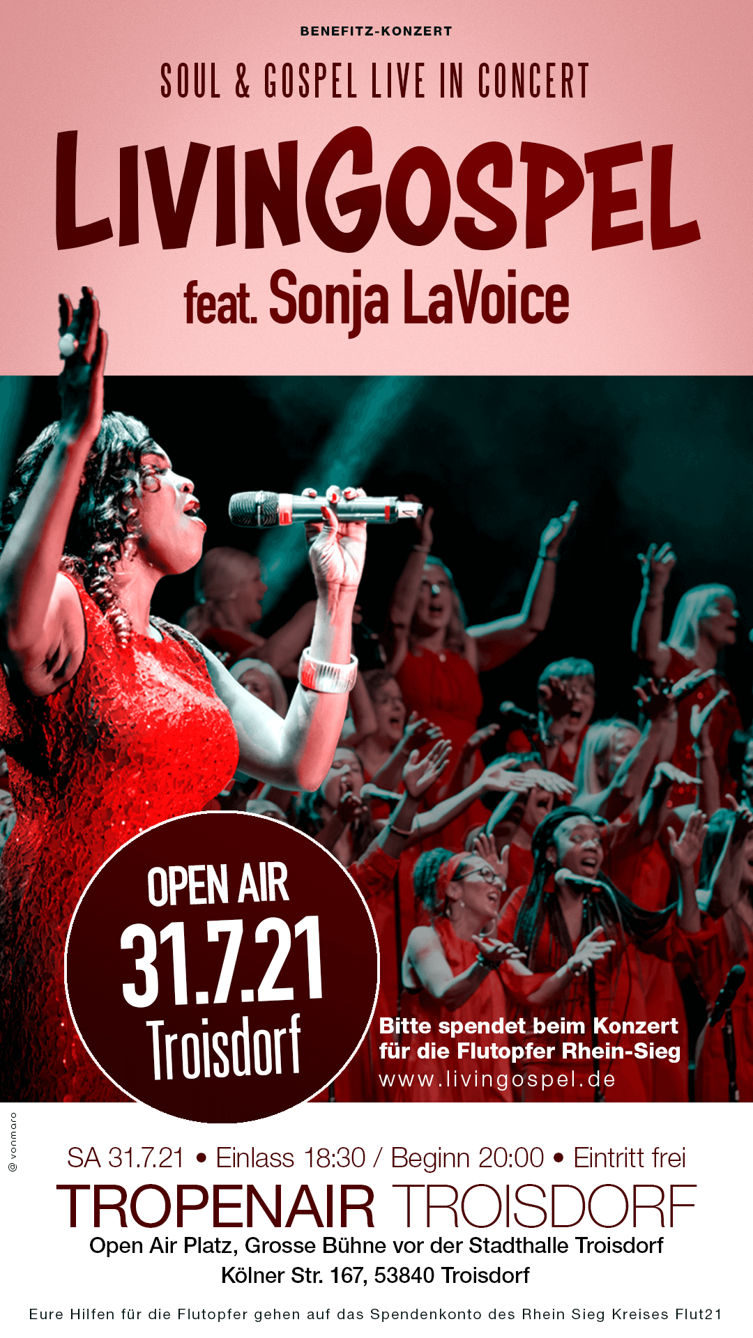 Gospelsongs vermitteln Hoffnung und Trost. Wir wollen an diesem Abend dazu beitragen, dass den Flutopfern in unserer Nachbarschaft geholfen wird. Wir tragen unseren Teil dazu bei und freuen uns über jede kleine oder große freiwillige Spende, die an diesem Abend komplett an die Flutopfer auf das Spendenkonto des Rhein Sieg Kreises Flut21 geht. (sagt Wolfgang Wien, Mitgründer von Livingospel)
